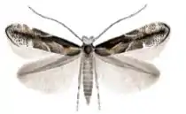 The wingspan is 7-7.5 mm. Adults are on wing from the end of June to mid-July and from the end of July to the end of August in two generations.