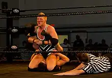 Also known as a lateral press, cross press, or simply as the basic pin. With an opponent lying face-up on the mat, the attacking wrestler lies face-down across the opponent's chest to hold them down. Sometimes, when both wrestlers are exhausted or badly hurt the attacking wrestler will cover with just an arm or lie down face up rather than face down. The term floatover (when in reference to a pin) refers to an attacking wrestler using the momentum of a throw or slam they are performing to propel themselves over the opponent into the lateral press position. A variation commonly used by The Undertaker sees the wrestler get on their knees behind the opponent's head and cross the opponent's arms across their chest, similar to a corpse. This is sometimes called a "Rest In Peace" pin, though there is no official name.[1] Another variation that was used by Kane includes the wrestler also getting on their knees behind the opponent's head and bringing the opponent's arms out and usually holding them down by the wrists. This pin does not have an official name either.