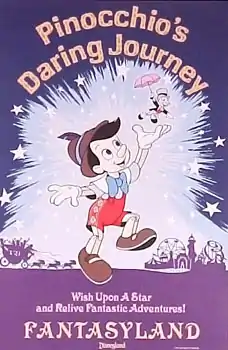 Pinocchio's Daring Journey is a dark ride at Disneyland in California, Tokyo Disneyland, and Disneyland Park in Paris. Located in the Fantasyland section of each park, this ride is based on Disney's 1940 animated film version of the classic story, which was the studio's second animated feature film.[1] The attraction tells an abbreviated version of the film, with Pinocchio escaping from Stromboli's puppet show and visiting Pleasure Island, ignoring Jiminy Cricket's advice. Monstro the whale makes an appearance, and Pinocchio is finally reunited with Geppetto and turned into a real boy.