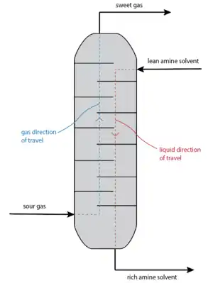 Simplified absorption column. Typical operating range: 35-50 °C and 5-205 atm of absolute pressure