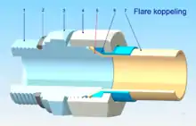 Flare connection: 1) Screw thread; 2) O-ring; 3) Body; 4) Nut; 5) Seal interface; 6) Support ring (sleeve), and 7) Flared tubing