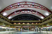The airport complex consists of two main buildings, the "Landside Terminal" and the "Airside Terminal". The terminal consists of 75 gates on four concourses; however, only 56 gates are available for use.[75] After passing through the security checkpoint, passengers board one of two underground people movers that travel to the Airside Terminal, where all departure gates are located. All international arrivals, except for cities with United States border preclearance, pass through Concourse C. American Airlines has an Admirals Club on the mezzanine level of the airside terminal.[76] The Club Lounge opened in October 2017 in the C Concourse across from gate C-52 near the center core[77] and was renovated and expanded in 2019.[78] The airport also operates a free lounge for active duty military and veterans in concourse C.