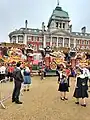 The third act, Let's Celebrate, was composed of carnival floats and featured street theatre acts and urban dance from various performer groups.[18] Highlights from the act included a dancer interacting with The Hatchling, a 21 feet (6.4 m) dragon puppet,[19] depictions of the Queen's Beasts that were also a part of her coronation, Asian/Bollywood wedding dances, the coronation scenes recreated with an Afro-Caribbean style, a mighty oak and maypole whose ribbons formed a picture of the Queen, depiction of past jubilees and royal weddings via dance, paper and with butterflies representing different faiths, the River of Hope flags featuring artworks by children, jazz music and sousaphones, a 20 feet (6.1 m) puppet of Godiva, and a mobile circus.[20]