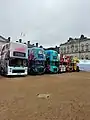 Pageant attendees with vehicles (including Daleks, motorbikes and bicycles) the buses and the celebrities riding them, first assembled at Horse Guards Parade in the early morning to prepare for the Pageant. This also included numerous interviews with news crews and journalists.