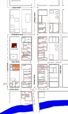 The district extends along the Michigan Road, now Michigan Street. The cross street at the southern end of the district is the LaPorte Trail or LaPorte Street, which runs between the Pennsylvania Railroad Depot on the west and the East Laporte Street Footbridge (National Register) on the east, over the Yellow River. Garro Street bi-sects the district. Just east of the district, Garro Street ends at the Yellow River, across from Lincoln High School, noted for its landscaping by Jens Jensen. The north end of the district is along Washington Street.[3]