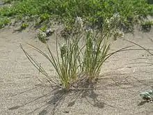Poa douglasii is a species of grass known by the common names Douglas' bluegrass and sand dune bluegrass. It is endemic to the coastline of California, where it grows in shifting sand dunes. It can be found mostly along the Central Coast and Channel Islands, and occasionally on the North Coast north of Mendocino. It is a perennial grass growing small, dense clumps up to about 30 centimeters in maximum height. It grows from a network of long rhizomes and stolons that anchor the grass to its loose sandy substrate; this network may be up to one meter long.[1] The inflorescence is a dense, oval-shaped series of overlapping spikelets. The grass is dioecious, with male and female individuals producing different types of flowers in their inflorescences.[2] This species, like many sand-dune endemic plants, is threatened by invasive species.