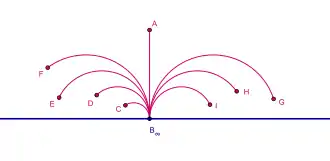 • a circular arc which intersects the x-axis at the same two ideal points as the half-circle which models its axis but at an acute or obtuse angle