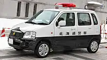 Police Vehicles in Japan are vehicles used by the prefectural police officers used for patrolling consisting of wide variety of vehicles depending on the environment and situation.[1] Most police vehicles in Japan are manufactured by domestic automakers such as Toyota, Nissan or Subaru. Unlike how some departments in the U.S. and Canada allows their officers to take-home their police vehicles, Japan does not allow the officers to take home any kind of law enforcement vehicle. Every marked police patrol vehicles are in black-and-white two tone livery, motorcycles are usually all white. Vehicles for riot police units are painted blue and white, and especially vehicles for the Rescue Squads of the TMPD are painted green and white. The formal name is "警邏車" (keirasha),[2] but in general the abbreviation "パトカー (Hepburn: patokā)" is widely used.[2]