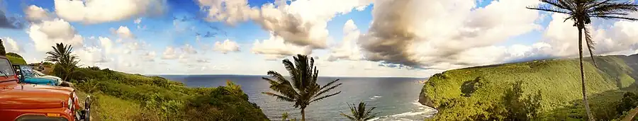 Pololū Valley is accessed from the North, from a lookout at mile 28 at the end of highway 270 [3](forming the terminus of Akoni Pule Highway) at coordinates 20°12′13″N 155°44′1″W / 20.20361°N 155.73361°W / 20.20361; -155.73361 (Pololū Valley Overlook).[4] A relatively short hike on a graded trail leads to the bottom of the valley. The trail continues beyond the valley, climbing over a ridge to neighboring Honokane Nui Valley.