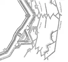 A diagram showing Vauban's method of approaching an enemy fortification using saps and parallels