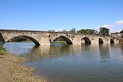 The Ponte Buriano is a 1277 stone seven-arch bridge that is located north of the town of Arezzo in the Tuscany region of central Italy. Some references tells that the bridge was used by Leonardo da Vinci in the lower-right quadrant of his painting Mona Lisa.[1]