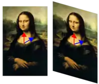 | In this shear transformation of the Mona Lisa, the central vertical axis (red vector) is unchanged, but the diagonal vector (blue) has changed direction. Hence the red vector is said to be an eigenvector of this particular transformation and the blue vector is not. Image credit: User:Voyajer |