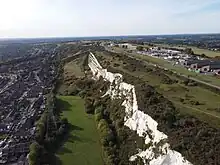 Portsdown Hill is a long chalk ridge in Hampshire, England. The highest point of the hill lies within Fort Southwick at 131m above sea level. The ridge offers good views to the south over Portsmouth, the Solent, Hayling Island and Gosport, with the Isle of Wight beyond. The hill is on the mainland, just to the north of Ports Creek, which separates the mainland from Portsea Island, on which lies the main part of the city of Portsmouth, one of the United Kingdom's main naval bases. To the north lies the Forest of Bere, with the South Downs visible in the distance. Butser Hill can be seen on a clear day. The hill is formed from an inlier of chalk which has been brought to the surface by an east–west upfold of the local strata known as the Portsdown Anticline.[1]