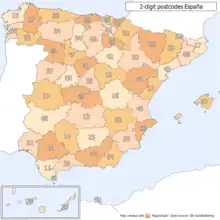 Spanish postal codes were introduced on 1 July 1984,[1] when the Sociedad Estatal de Correos y Telégrafos introduced automated mail sorting. They consist of five numerical digits,[2] where the first two digits, ranging 01 to 52, correspond either to one of the 50 provinces of Spain or to one of the two autonomous cities on the African coast.