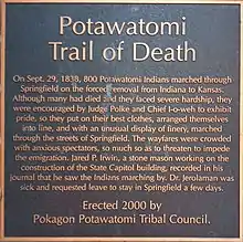 At Springfield, the Potawatomi men were promised tobacco if they made a good appearance while passing through. Chief Ioway (I-o-weh) took charge of making everyone presentable. They were able to find plenty of food this day by foraging through the countryside, but two children died overnight.[44][96] A marker on Oak Crest Road, at the golf course, was erected by Springfield chapter of Daughters of the American Revolution in 1995. A metal plaque placed at Old State Capitol Plaza on side of building leading to the parking garage was placed by Pokagon Potawatomi in 2001.[98]