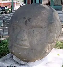 Potbelly sculptures from Sin Cabezas are stylistically related to Olmec sculpture but were reused by later peoples, being found in fill dating to the Late Classic period. The monuments at Sin Cabezas were headless when they were found and no fragments of the missing heads were evident, suggesting that they had already been damaged when they were re-erected by later occupants of the site.[24]