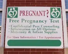 CPCs have been criticized for deceptive advertising. Some falsely advertise abortion services, attracting clients who wish to have an abortion.[6][25][103][104] In the 1980s, investigative reporters from the Arizona Republic, the San Francisco Chronicle and CBS News, among others, filed stories about CPCs attracting women by offering free pregnancy tests but then presenting them with religious arguments and scare tactics against abortion.[105] CPCs may intentionally locate near, and look like, abortion clinics;[5][31] critics have also objected to CPCs' use of rhetoric and advertising language similar to those of abortion providers, such as "Plan Your Parenthood" or a directory listing under "abortion services" or "clinics". These, they say, may mislead pregnant women seeking abortion into contacting a CPC.[5][33][31][106] In particular, the advertising approach of the Pearson Foundation, which assists local groups establishing CPCs, has been criticized by some other anti-abortion groups, including Birthright International, another CPC operator.[65] The foundation recommends that a center seek out women who want abortions through "neutral" advertising, and refuse to answer questions that would reveal that they provide neither abortion services nor referrals to abortion services.[65] Pearson, identified by some as the founder of the first CPC, said that a woman "has no right to information" that will allow her to have an abortion.[93] In Ireland, when abortion was illegal except in circumstances where pregnancy endangered the mother's life and women often went to the United Kingdom to end their pregnancies, "rogue" CPCs, in contrast to government sponsored pregnancy centers, might falsely give the impression in their advertising that they referred women to Britain for abortions or otherwise provided information for women seeking to travel for abortion.[107][108]