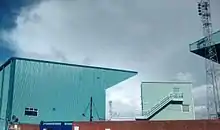 The Cowshed houses away fans at Prenton Park, and has a capacity of 2,500.[4] It has a slanted seating arrangement, caused by the main road running behind it.[13] It historically housed the more vocal home fans, but was switched to away supporters around the start of the 21st century.[13] Since the change, a bar and TV screens have been added to the stand.[13] The name is derived from its appearance before the redevelopment in 1995. With a 3 peak roof of corrugated iron, walls of wooden plank and a cinder bank floor it visually resembled an agricultural building.