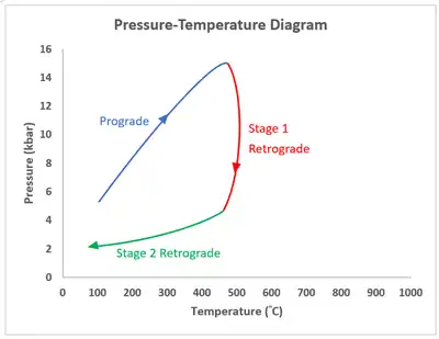 P-T-t paths often reflect various stages of the metamorphic cycle.[3] A metamorphic cycle implies the series of processes that a rock experienced from burial, heating to uplift and erosion.[3] The P-T conditions experienced by a rock throughout these processes can be classified into three main stages according to temperature changes:[3]