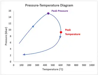 It is commonly observed that the peak temperature is reached prior to the peak pressure in anticlockwise P-T-t paths, as the rocks usually experienced the heat from the heat source before being extensively pressurized.[12]