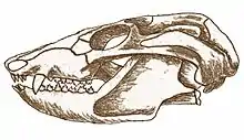The skull of Probainognathus was on average around 7 centimetres (2.8 in) in length, and lacked the pineal foramen.[1] The skull was broad in proportion to its length, the face was short and narrow, but its zygomatic region was relatively large, seemingly for jaw muscle attachment.[1] The skull also possessed a double occipital condyle, which is a typical mammalian feature.[9] In comparison to close relatives, such as Chiniquodon, the braincase of Probainognathus was broader in the parietal region, and the oticoccipital region of the skull was deeper. Likewise, the parietals had more depth, the occipital crest was higher, and the orbits were proportionately larger relative to the rest of its head. The sagittal crest was also lengthened posteriorly, and split into the occipital crests. This led to a straighter posterior margin, and a more concave occiput in Probainognathus.[1]