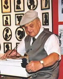 The skill was not lost, and travelling silhouette artists continued to work at state fairs into the 20th century. E. J. Perry and Dai Vernon were artists active in Coney Island at this time as well. The popularity of the silhouette portrait is being reborn in a new generation of people who appreciate the silhouette as a nostalgic way of capturing a significant occasion. In the United States and the UK silhouette artists have websites advertising their services at weddings and other such functions.[6][21][22] In England there is an active group of silhouette artists.[23][12][24] In Australia, S. John Ross plied his scissors at agricultural shows for 60 years until his death in 2008.[25] Other artists such as Douglas Carpenter produce silhouette images using pen and ink.[26]