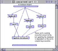Several features of the Prograph system are evident in this picture of a database sorting operation. The upper bar shows that this method, concurrent sort, is being passed in a single parameter, A Database Object. This object is then fed, via the lines, into several operations. Three of these extract a named index (indexA etc.) from the object using the getter operation (the unconnected getter output passes on the "whole" object), and then passes the extracted index to a sort operation. The output of these sort operations are then passed, along with a reference to the original database, to the final operation, update database. The bar at the bottom of the picture represents the outputs of this method, and in this case there are no connections to it and so this method does not return a value. Also note that although this is a method of some class, there is no self; if self is needed, it can be provided as an input or looked up.