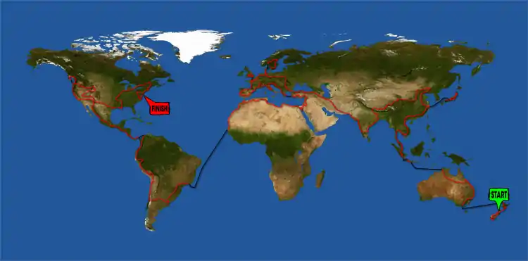 Project EVIE's expedition was intended to begin in New Zealand, continue by boat to Australia,[3] then to Singapore. The expedition team would have crossed Southeast Asia into mainland China, Japan, Nepal and into India. The expedition would have continued into Southern Pakistan, Iran and entered Europe through Turkey. After a loop around Europe, the expedition would have gone through Syria, Lebanon, Jordan and Israel, entering Africa through Egypt. The expedition route was planned to continue across North Africa to Dakar, Senegal and continue by boat to Rio de Janeiro, Brazil.