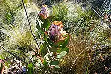 The shrub grows upright, and grows up to a height of 1.2 metres. It blooms from June to January, peaking in September to October. The plant is monoecious with both sexes in each flower. Pollination occurs through the action of birds rooting in the large flowerheads for nectar. The seeds are stored in woody capsules and are dispersed by means of the wind.[5]