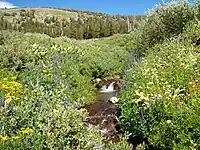 Mono County | March 31, 2009[51] | 14,721 acres (23.002 sq mi; 59.57 km2)[51] | 7,760–11,549 ft (2,370–3,520 m)[22] | The uppermost headwaters of the Owens River, which goes on to flow through the desert valley that shares its name, are protected by this relatively new wilderness area.San Joaquin Mountain, rising over 11,500 feet above sea level to be the highest peak in the area, overlooks the surrounding wilderness below. This mountain, though, is part of a relatively low section of the Sierra Crest, allowing enough moisture to spill over for dense conifer forests to grow.[51] |