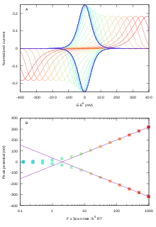- Ideally, the peak position is in both directions. The peak current is (it is proportional to scan rate, , and to the amount of redox sites on the electrode, ). The ideal half width at half height (HWHH) equates mV at 20 °C. Non-ideal behaviour may result in the peak being broader than the ideal limit.