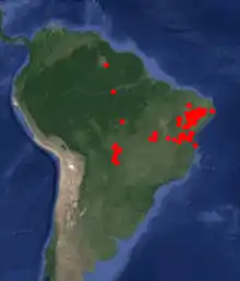 It is found in the Amazon Rainforest, the Central Brazilian Savanna, Atlantic Rainforest and Pantanal,[4] in the Caatinga, Carrasco Vegetation, Cerrado ecoregion, Riverine Forest and/or Gallery Forest, Terra Firme Forest, flooded forest (Várzea), and Tropical Rain Forest.[4]