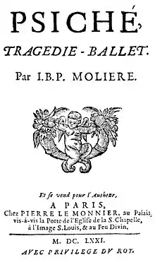 Psyché is a five-act tragicomédie et ballet, originally written as a prose text by Molière and versified in collaboration with Pierre Corneille and Philippe Quinault, with music composed by Jean-Baptiste Lully in 1671 and by Marc-Antoine Charpentier in 1684 (music lost). The plot is based on the story of Cupid and Psyche in The Golden Ass, written in the 2nd century by Apuleius. It was first performed on 17 January 1671 before the royal court of Louis XIV at the Théâtre des Tuileries, with ballets by Pierre Beauchamps, Anthoine des Brosses, and Nicolas Delorge, and spectacular scenery and special effects designed by Carlo Vigarani.[1]