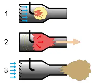 Starting with ignition within the combustion chamber, a high pressure is raised by the combustion of the fuel-air mixture. The pressurized gas from combustion cannot exit forward through the one-way intake valve and so exits only to the rear through the exhaust tube.