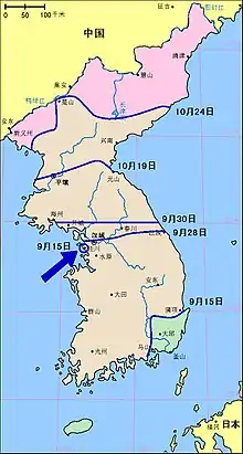 North Korea's lack of large airstrips and aircraft meant it conducted only minimal air resupply, mostly critical items being imported from China. Other than this, however, aircraft played almost no role in North Korean logistics.[50] The North Koreans were also unable to effectively use sea transport. Ports in Wonsan and Hungnam could be used for the transport of some troops and supplies, but they remained far too underdeveloped to support any large-scale logistical movements, and the port of Inchon in the south was difficult to navigate with large numbers of ships.[51][52]