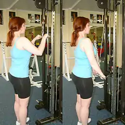 Rope push-down is a variation that involves connecting a rope attachment to a cable machine. While executing a rope push-down you have your palms facing in and internally rotate your arms while pushing down. This variation works all three parts of your tricep, but especially the lateral head (the yellow part of tricep on diagram).[1]