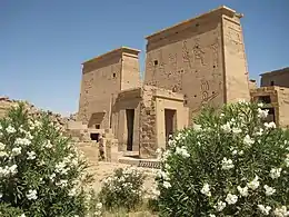 Pylons were often decorated with scenes emphasizing a king's authority since it was the public face of a building.[2] On the first pylon of the temple of Isis at Philae, the pharaoh is shown slaying his enemies while Isis, Horus and Hathor look on. Other examples of pylons can be seen in Karnak, Luxor Temple and Edfu. Rituals to the god Amun were often carried out on the top of temple pylons. A pair of obelisks usually stood in front of a pylon.