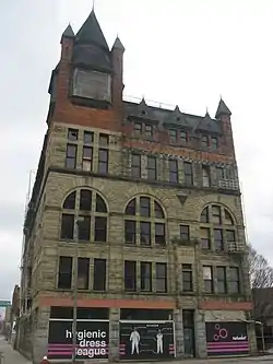 The 30,000-square-foot building[2] was built in 1890 by the Knights of Pythias, a fraternal organization and secret society, to use as a meeting place.[3] The building was designed by Norval Bacon and Thomas Huber, partners of the Toledo architectural firm of Bacon & Huber.[4] The highest point of the Pythian Castle, the turret on Jefferson Avenue at City Center, rises 122 ft (37 m) above the street. The height of the main roof is 79 ft (24 m).