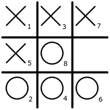 The second player has just made move O8. The first player must now choose whether to collapse O8 into the upper right square or the middle square. (Either way, O is going to get three-in-a-row.)