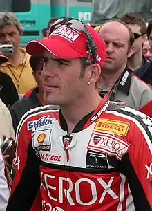For 2001 he was a factory Aprilia WSBK rider. He led the first lap of the season, but struggled for much of the season on circuits he did not know. Until the final round at Imola his best result was a 4th, but he benefitted from knowing this circuit (which, like himself, was new to WSBK after being familiar in 500cc). He qualified 2nd, and won the second race, after running strongly in race 1 before being taken out by a fall for champion Troy Bayliss. A move to MotoGP for 2002 was not successful, with a best result of 8th, so for 2003 he returned to WSBK for the Caracchi Ducati team, doing enough to earn a factory ride for 2004 by taking 5 podium finishes, finishing 4th in a relatively weakened championship.