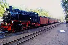 The Rügen narrow-gauge railway (German: Rügensche Bäderbahn, formerly Rügensche Kleinbahn or RüKB) – nicknamed Rasender Roland ("Raging Roland") – is a steam-powered narrow-gauge railway that runs from Putbus by way of Binz, Sellin, and Baabe to Göhren on the island of Rügen off the Baltic Coast in Mecklenburg-Vorpommern, Germany. Since 2008, it has been run by the Eisenbahn-Bau- und Betriebsgesellschaft Pressnitztalbahn mbH.[1] There is an interchange with the island's Deutsche Bahn mainline network via the Veolia-run OLA railways. The Rasender Roland is one of the island's tourist attractions. It serves several holiday destinations, mainly the bathing resorts in Rügen's southeast.