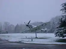 Fighter Command's Spitfire gate guardian. The aircraft was replaced by this fibre glass replica in 1992 when the original Spitfire was sold by the RAF into private ownership to be restored to flying condition