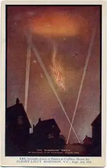 The first recorded interception of an enemy airship over Britain was made by Lt. (later Marshal of the Royal Air Force) John Slessor on the very day he arrived at Sutton's Farm, 13 October 1915. The attack had to be aborted as the airship disappeared into cloud and he had to break off the engagement.[4] The first victory in Britain was not recorded until nearly a year later, on 2 September 1916 and was attributed to a pilot from Sutton's Farm, Lt. William Leefe Robinson. Robinson shot down a Schütte-Lanz SL11, one of a 16-strong raiding force over London, using new Brock and Pomeroy mixed incendiary ammunition, which had been adapted for this task.[5] For this action Leefe Robinson was awarded the Victoria Cross and became a National hero. Two other Sutton's Farm pilots from the First World War, Lt. Frederick Sowrey and Lt. Wulstan Tempest, were awarded the DSO for their roles in the destruction of Zeppelins.[6] Tempest's actions were particularly notable; even though his fuel pump was broken and he was having to pump fuel manually whilst flying the aircraft with his other hand, he still managed to engage and destroy an enemy airship and then find his way home in thick fog. These pilots, together with many others, are commemorated by street names in South Hornchurch.[7]