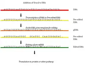 RNA editing through the addition and deletion of uracil has been found in kinetoplasts from the mitochondria of Trypanosoma brucei.[39] Because this may involve a large fraction of the sites in a gene, it is sometimes called "pan-editing" to distinguish it from topical editing of one or a few sites.