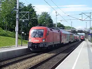 R 510/900 is a commuter/regional rail service operating between Wiener Neustadt and Bernhardsthal with extended service to Břeclav in the Czech Republic.[1] R 510 and R 900 are two separate services that run interchangeably allowing direct service between the two points. The service is operated by the Austrian Federal Railways (ÖBB) in cooperation with VOR (Eastern Region Transportation Authority). R 510 begins at Wiener Neustadt Hauptbahnhof (Central station) in the south and travels to Vienna along the Southern Railway (Südbahn), the busiest railway in Austria. North of Vienna, most trains switch to the R 900 route. R 900 service uses the Northern Railway (Nordbahn) to Bernhardsthal and Breclav.