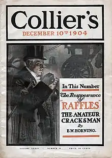 The first story, "The Ides of March", appeared in the June 1898 edition of Cassell's Magazine.[1] The early adventures were collected in The Amateur Cracksman[2] and continued with The Black Mask (1901).[3] The last collection, A Thief in the Night (1904)[4] and the novel Mr. Justice Raffles (1909)[5] tell of adventures previously withheld. The novel was poorly received, and no further stories were published.[6]