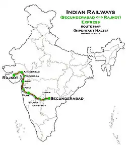 The Rajkot–Secunderabad Express is a popular train in the South Central Railway zone of the Indian Railways. It is only one of three trains connecting Hyderabad with Rajkot in the state of Gujarat, the other two being the Bhavnagar Terminus–Kakinada Port Express and the Rameswaram–Okha Express. The train was introduced in the year 1985 to run from Ahmedabad to Hyderabad as a weekly super-fast train. But, due to the increasing rush of passengers the train was made bi-weekly in June 2001[1] and tri-weekly in April 2003.[2][3] The train was later extended to Rajkot and was degraded to Express status as the number of stops were increased.
