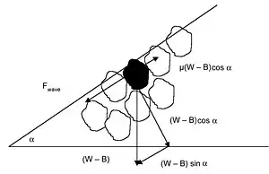 This improvement includes a friction coefficient, , and was a result of research and experiments by Iribarren and his colleagues during the period between the first (1938) and final (1965) publication of the Iribarren formula.[41] He had undertaken wave flume experiments and research into factors including the type of wave breaking, wave run-up and run-down, friction and interlocking between units, and the types of failure possible in breakwaters in the intervening period.[47] Iribarren proposed that the force of a wave can be approximated by: