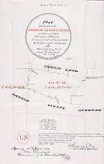 Diseños are hand-drawn maps submitted to the U.S. government indicating the extent of a land grant as understood by the grantees.[8] Diseños and expedientes (written descriptions of the grants) were used during the U.S. land-patent process that began when Mexican Alta California became the U.S. state of California in 1850.[8] Diseños are distinct from later maps produced by U.S. surveyors within the extant American rectangular survey system.[8] Several of the earliest surveys, or plats, of Los Angeles-area ranchos were done by Henry Hancock, who himself owned Rancho La Brea and through his son is a namesake of the Hancock Park neighborhood. As for the cattle brands, many of the large ranchos had multiple brands for various herds or during various eras; the single one included here is the earliest known example.[9] Land patents were ultimately granted to over 60 Mexican, Anglo and indigenous Angelenos; the indigenous contingent was represented by Doña Victoria Reid of Rancho Huerta de Cuati, who was Gabrieleño Tongva, and Odón Chihuya, Urbano Chari, and Manuel (later Espíritu Chijulla) of Rancho El Escorpión, who were from a leading family of Fernandeño Tongva.[3]