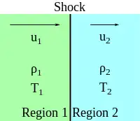 In a coordinate system that is moving with the discontinuity, the Rankine–Hugoniot conditions can be expressed as:[4]